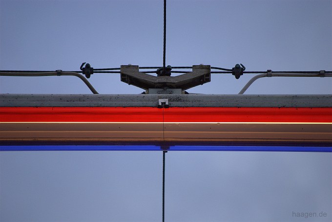 Seilleuchten-System aus Leuchtstoffröhren. Hier erfolgt die seitliche