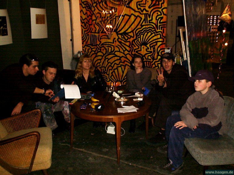 Die Kuenstlerecke in der ehemaligen Elektrowerkstatt der Thier-Brauerei im April 2000: (von links) Architekt Jens Schran, Mike Herdrich, Bettina Broekelschen, Manuela Herdrich, Stefan V Grey und Jochens Sohn, fotografiert von Thomas Haagen