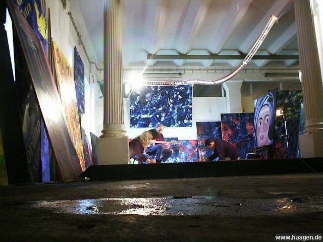 Im "AThierlier 2000": Jochen Schrumpf spielt Gitarre zur Malerei mit Bettina und Mike