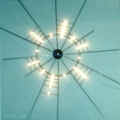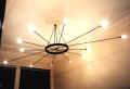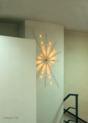 Das Lichtobjekt wirkt wie ein leuchtendes Spinnennetz. Maße: ca. H50xB150cm Lichtobjekt wahlweise für die Wand- und Deckenmontage, bestehend aus einem farblosen Acrylglasring, wahlweise 6 Edelstahl- oder Messingstangen und 44 SOFTEC© - Speziallampen. Der mitgelieferte 12V/60W Dimmertrafo wird an das Ende der Edelstahlstangen angeschlossen bzw. bei der Deckenversion mittig vorinstalliert. Ersatzlampen liegen dem Objekt bei. Die Deckenversion ist mit Halogenstrahlern ausgestattet.